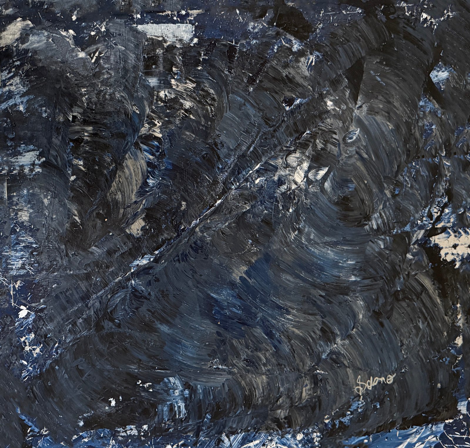 For Solano, blue is much more than a color: it is origin and destiny, beginning and end. He proclaims it as germinal matter, the ovum of light in water, a vital force capable of transforming and dissolving. To paint, within this horizon, is not an aesthetic choice but a necessity of life — a physiological gesture, breath, blood.